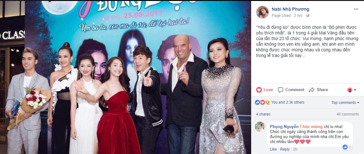 Không thể có mặt để nhận giải, Nhã Phương bày tỏ niềm tiếc nuối khi niềm vui không trọn vẹn vì thiếu vắng đạo diễn Stephane Gauger.