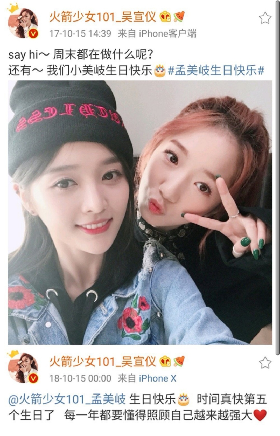 Trong gần hai năm ra mắt với Rocket Girls 101, fans của hai nhà Mạnh Mỹ Kỳ và Ngô Tuyên Nghi tìm đề tài nói xấu đối phương vô số lần và chủ đề hot search xuất hiện không ngừng. Chỉ cần một câu không hợp thì sẽ “bay ra đánh nhau”, làm cho hai thần tượng cảm thấy ái ngại. Trước đó có người nói rằng tình cảm chị em của họ chỉ là giả mà thôi, trên ống kính thì chị em tình thâm còn ngoài đời thì lạnh nhạt.