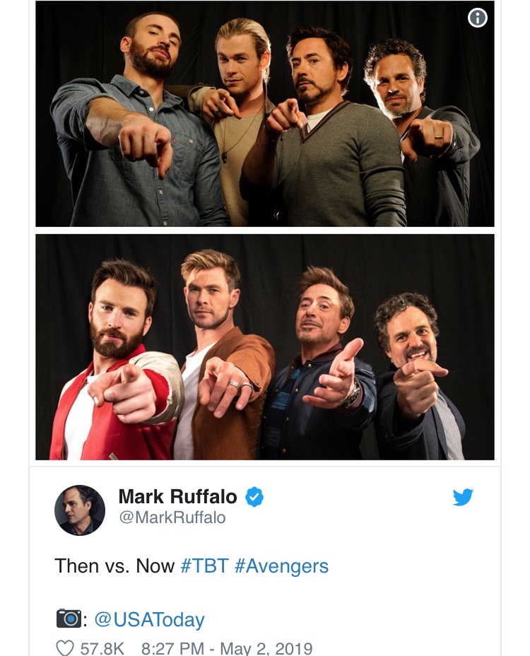 Một trong những bài đăng gần đây nhất đến từ Mark Ruffalo - người đã đăng bức ảnh bộ tứ siêu Avengers gồm anh ấy, Chris Evans, Chris Hemsworth và Robert Downey Jr ngày xưa và thời điểm hiện tại. Cùng với bức ảnh đó là dòng chữ: “Ngày xưa và bây giờ”.
