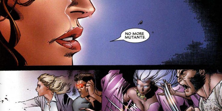 “Decimation” chắc chắn là một thuật ngữ thích hợp. Bởi vì nó được lấy trực tiếp từ truyện tranh, nơi mà nó thường được dùng để đề cập đến hậu quả khủng khiếp của sự kiện “House of M“. Câu chuyện kể về mụ phù thủy Scarlet đã phá huỷ mọi thứ trừ một phần mười những người đột biến trên thế giới. Vô số những người đột biến xấu số đã chết trong cuộc phá hủy đó; và số người còn lại thì nằm trong tình huống nguy hiểm, có lẽ họ đã mất đi khả năng bay lượn của của mình trong khi bay qua tầng bình lưu. Cũng có nhiều người chọn cách tự kết liễu mạng sống của mình, có thể vì họ không thể chịu được sự mất mát của những thứ đã là một phần cốt lõi không thể thiếu của họ.