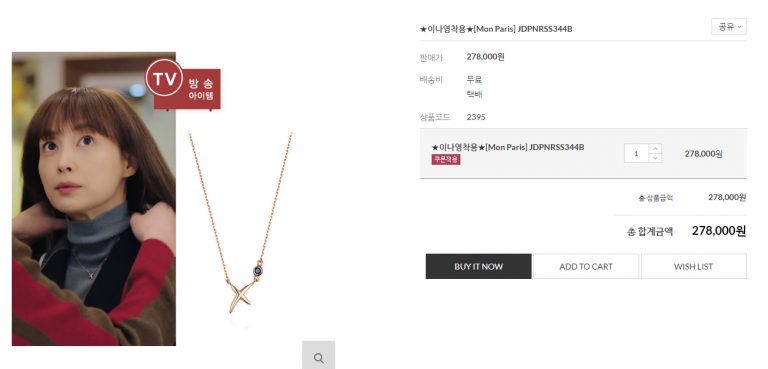 Trong tập 9, Lee Jong Suk (vai Cha Eun Ho) được nhìn thấy đang chọn trang sức cho Lee Na Young (vai Kang DanYi). Sau khi chọn một sợi dây chuyền, anh ấy đã tặng chiếc vòng cổ này cho Lee Na Young trong Romance is a Bonus Book. Đó là sản phẩm từ thương hiệu DIDIER DUBOT, có tên là Mon Paris Necklace [JDPNRSS344B], có giá khoảng 249 USD.