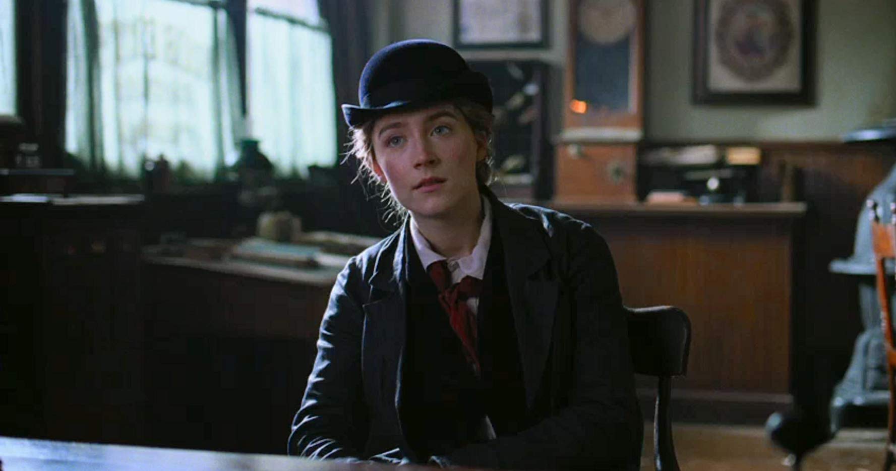 Trang phục cũng là thứ giúp phản ánh quá trình phát triển của Jo. Ở đầu phim cô xuất hiện trong căn phòng u tối và cố gắng hòa hợp khi diện cho mình bộ trang phục giống như những người đàn ông ở đây. Khi ấy khán giả thấy một Jo nhút nhát, e dè, cố gắng giấu những vết mực còn hằn trên ngón tay và nói dối rằng đây là câu chuyện do bạn cô viết. Nhưng đến cuối phim, Jo đã lột xác hoàn toàn khi cho thấy sự quyết đoán, mạnh mẽ của mình qua từng lời nói, cử chỉ. Bộ trang phục cô mặc cũng được bổ sung thêm chiếc mũ đầy nam tính và chiếc cà vạt màu đỏ tượng trưng cho tính cách. Jo đã dám thể hiện những nét đặc trưng của mình thay vì sống trong vỏ bọc của người khác.