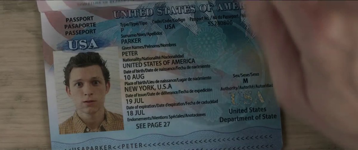 Ngoài ra, trong hộ chiếu của anh chàng cũng đã tiết lộ một số thông tin, bao gồm có ngày sinh nhật 10/08. Đây cũng là ngày phát hành quyển truyện tranh Amazing Fantasy #15 - không chỉ giới thiệu Peter Parker và Spider-Man mà còn là lần đầu xuất hiện các nhân vật Dì May, Bác Ben cùng Flash Thompson.
