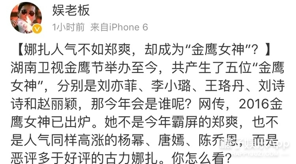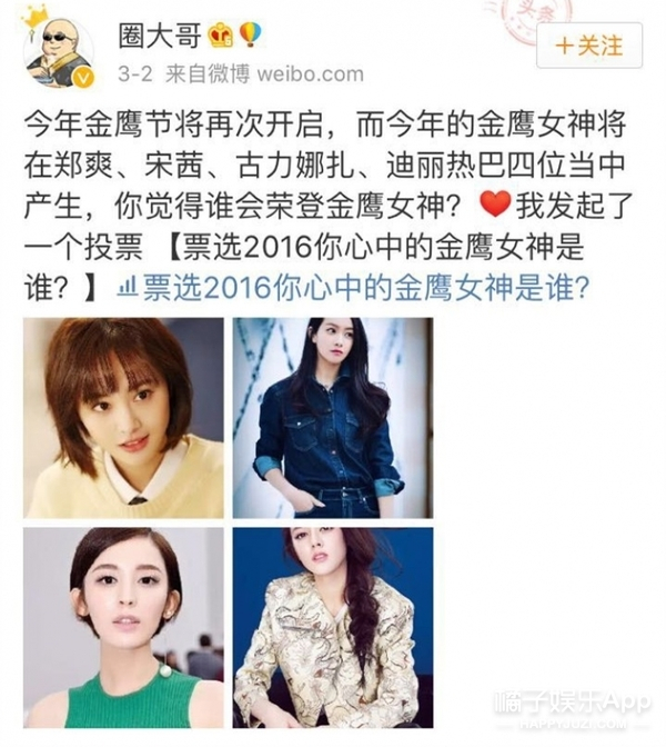 Còn vào năm 2016, “bộ phim dài tập” này chủ yếu xảy ra giữa hai nhà fan Cổ Lực Na Trát và Trịnh Sảng. Khi ấy tác phẩm phát sóng của Trịnh Sảng tương đối nhiều, nhân khí lại cao, vì vậy đa số cư dân mạng đều cho rằng Trịnh Sảng sẽ có thể giành lấy được vị trí Nữ thần kim ưng này.