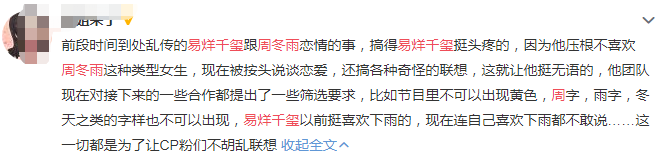 Trước đây, Vương Tuấn Khải và Dương Tử từng hợp tác trong Nhà hàng Trung Hoa 3 khiến tin đồn hẹn hò xuất hiện không ít. Cũng chính vì vậy, khi ekip nam minh tinh đàm phán hợp đồng tham gia show thực tế đều phải suy nghĩ đến vấn đề hợp tác với đồng nghiệp nữ. Điều này sẽ gây ra một số hạn chế, nếu quá cân nhắc, sợ gặp phải tin đồn thì sẽ đánh mất những tài nguyên tốt.