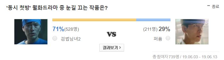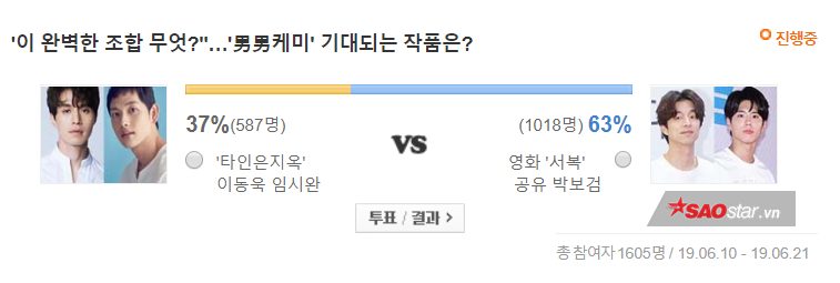 Hiện tại, Gong Yoo và Park Bo Gum của phim điện ảnh Seo Bok dẫn trước khi mang về 1018 phiếu bầu (63%). Trong khi, Lee Dong Wook và Im Siwan trong drama Strangers From Hell đài OCN nhận được 587 lượt bình chọn, chiếm 37%.