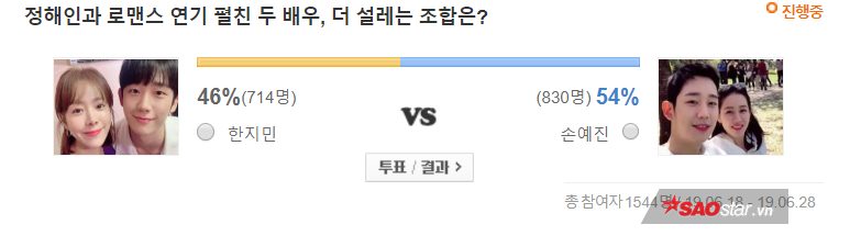 Có 714 người (46%) người chọn Han Ji Min. Trong khi đó, Son Ye Jin nhận được 830 phiếu bầu, chiếm 54%.