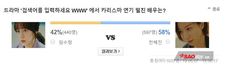 “Ảnh hậu” Im Soo Jung nhận được 42% với 440 người bình chọn. Diễn viên điện ảnh Jeon Hye Jin có 597 phiếu, chiếm 58%.