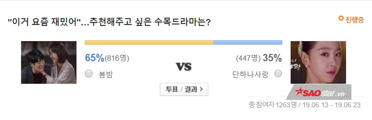 Có đến 816 người (65%) chọn melodrama Đêm xuân đài MBC của Han Ji Min - Jung Hae In và 447 người bầu chọn cho Thiên thần vô tư đài KBS của Shin Hye Sun - Kim Myung Soo (L).