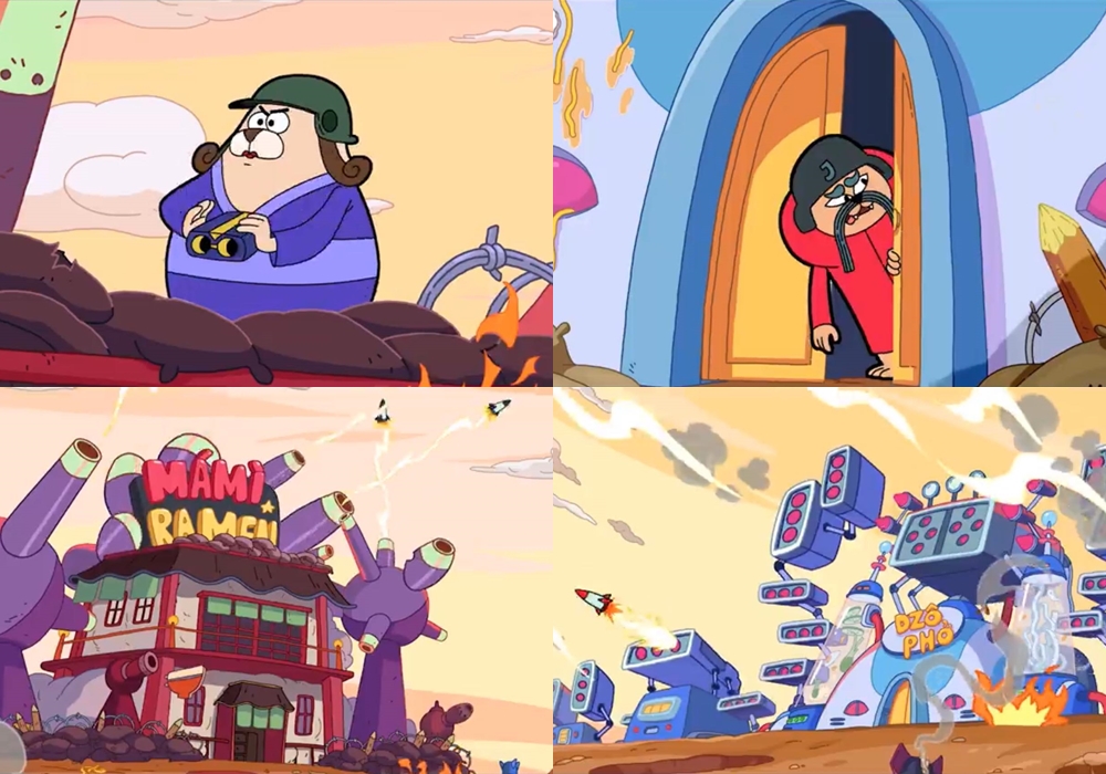 Ở Hành tinh Mì, nếu để ý kĩ thì trong quán Má Mì Ramen có dán áp phích trông giống như bức tranh Uncle Sam kêu gọi gia nhập lực lượng quân sự Mĩ. Nếu trong quá khứ, đây là bức áp phích tuyên bố chiến tranh thế giới thứ I, thì giờ đây nó lại được sử dụng đế “châm ngòi” chiến tranh giữa Má Mì Ramen và Dzô Phở.