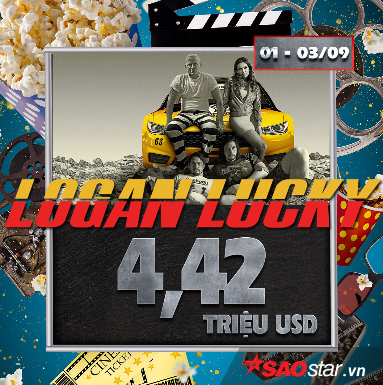Vị trí thứ 5 thuộc về Logan Lucky với 4,4 triệu USD cho 3 ngày vừa qua, tăng 4% so với tuần trước và hy vọng đạt được 5,6 triệu USD sau khi kết thúc dịp lễ Lao động tại Mỹ, giúp cho doanh thu tại Bắc Mỹ đạt 23 triệu USD.