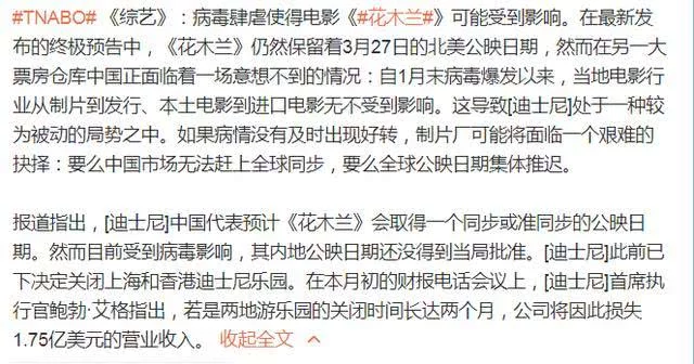 Với tình hình dịch bệnh ngày càng lan rộng như hiện nay, ngành điện ảnh Trung Quốc chịu ảnh hưởng không nhỏ. Trước đó, 7 bộ phim dự kiến công chiếu trong dịp Tết Nguyên đán buộc phải dời lịch. Không những thế, 22 bộ phim lên kế hoạch ra mắt vào ngày lễ tình nhân cũng đối mặt với nguy cơ lớn tạm hoãn, nhiều bộ phim mới dự kiến phát sóng vào tháng 3 cũng sẽ chịu ảnh hưởng lớn, cùng chung bi kịch có Mulan (Hoa Mộc Lan), e rằng cũng phải dời lịch công chiếu ở Trung Quốc.