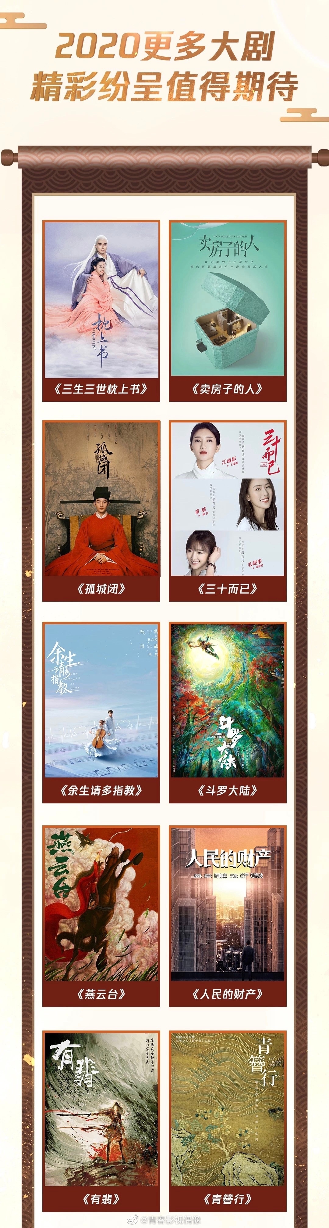 Ngoài ra còn có một số tác phẩm đáng chú ý khác như Cô thành bế do Vương Khải và Giang Sơ Ảnh đảm nhận vai chính, Ba mươi mà thôi (Giang Sơ Ảnh, Đồng Dao), Đấu La đại lục (Tiêu Chiến và Ngô Tuyên Nghi), Yến vân đài (Đường Yên và Đậu Kiêu), Tài sản của nhân dân (Cận Đông và Diêm Ni).