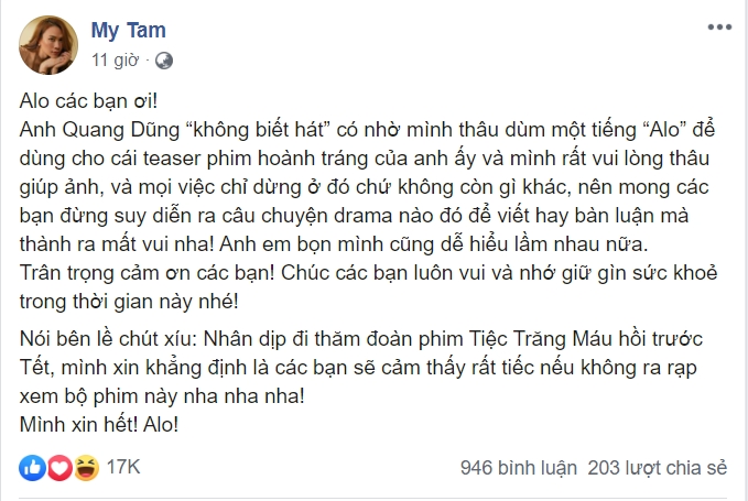 Cụ thể, Mỹ Tâm cho biết:”Anh Quang Dũng “không biết hát” có nhờ mình thâu dùm một tiếng “Alo” để dùng cho cái teaser phim hoành tráng của anh ấy và mình rất vui lòng thâu giúp ảnh, và mọi việc chỉ dừng ở đó chứ không còn gì khác, nên mong các bạn đừng suy diễn ra câu chuyện drama nào đó để viết hay bàn luận mà thành ra mất vui nha! Anh em bọn mình cũng dễ hiểu lầm nhau nữa“. Như vậy, Mỹ Tâm sẽ không tham gia mà chỉ góp giọng duy nhất ở 1 câu thoại của teaser phim.