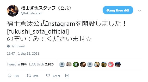 Vào ngày đầu tiên của tháng 11, tài khoản twitter từ staff của nam diễn viên nổi tiếng Fukushi Souta đã đăng “Instagram chính thức của Fukushi Souta đã mở. Xin mời vào xem thử [fukushi_sota_official] ☆.