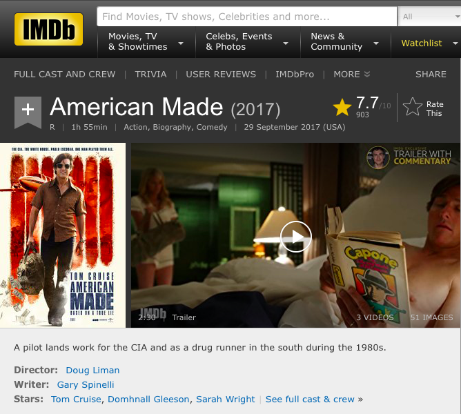 Bộ phim American Made (tựa tiếng Việt: Lách luật kiểu Mỹ) của hãng Universal dựa trên một câu chuyện lịch sử có thật của một cựu phi công TWA - người bị bắt vào năm 1984 vì buôn súng, rửa tiền và vận chuyển ma túy trong máy bay mình cho Medellin Cartel tại Colombia. Cũng chính vì là một gã phi công cự oách, Barry Seal nhanh chóng được CIA để mắt và được chiêu mộ để thực hiện loạt nhiệm vụ chính trị vùng Trung Mỹ. Thực hiện song song hai việc làm tưởng chừng như không thể nhưng chính Barry đã làm điều này trong 3 năm, hắn đã vận chuyển thành công số lượng lớn cocaine và khiến Nhà Trắng có một phen bẽ mặt khi sự việc được phanh phui.