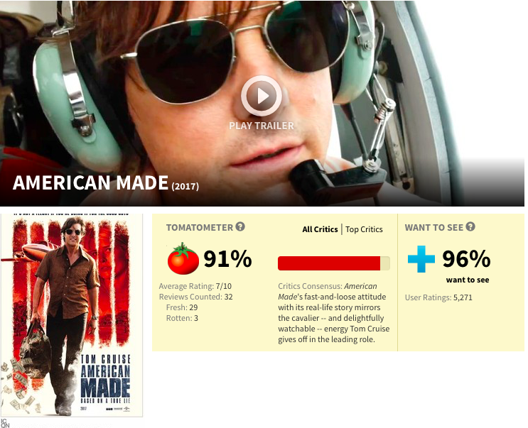 Tuy nhiên, dù đã có những pha gây cười cho người xem nhưng không phải bất kỳ khán giả nào cũng “chịu được” thể loại phim về đề tài chiến tranh như thế này. Có thể nói bộ phim đã mang lại một Tom Cruise rất khác làm nên thành công cho American Made nhưng cũng chính vì nhân vật và câu chuyện thì không phải ai cũng có thể cảm được nó. Có thể chúng ta vẫn không chắc về mặc doanh thu ở thị trường quốc tế có ổn hay không nhưng trước mắt bộ phim đã được đánh giá rất cao chẳng hạn đạt được 7.7/10 trên IMDb hay đạt tận 91% của Rotten Tomatoes.