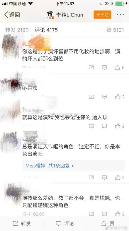 Nhưng, chửi trên các trang mạng là chưa đã, họ lại tiếp tục cất công lặn lội qua Weibo chính của Lý Thuần áp đảo khổ chủ như thể chính họ là người bị hại trong phim. Dưới đây là một vài bình luận trên Weibo của nữ diễn viên Lý Thuần.