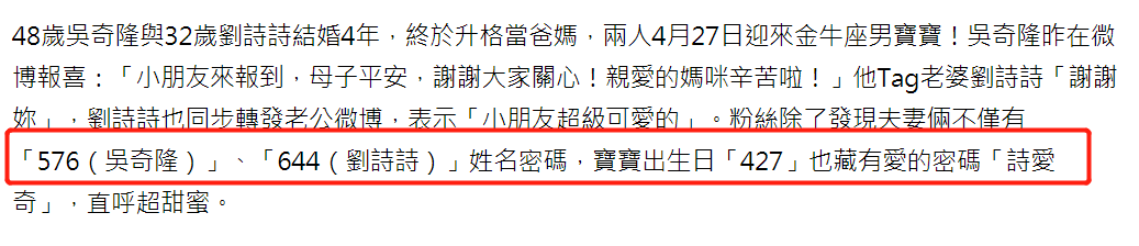 Tên của Ngô Kỳ Long dùng số tự để biểu đạt là “576”, của Lưu Thi Thi là “644”, ngày sinh của bảo bảo là “427”, đồng âm chính là “Thi yêu Kỳ”, như thế xem ra hai vợ chồng họ cùng với bảo bảo thật sự là duyên trời định rồi, giúp gắn kết mối quan hệ hai người họ đến gần với nhau hơn.