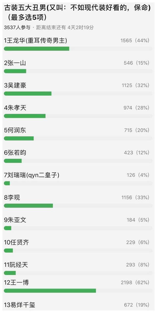 Bảng xếp hạng này được bầu chọn với hơn 3000 phiếu do cư dân mạng, bất ngờ khi thấy số phiếu bầu cao đều nằm trong các tiểu lưu lượng hàng đầu hiện này như Vương Nhất Bác, Lý Hiện, Trương Nhược Quân, Trương Nhất Sơn và Dịch Dương Thiên Tỉ,…