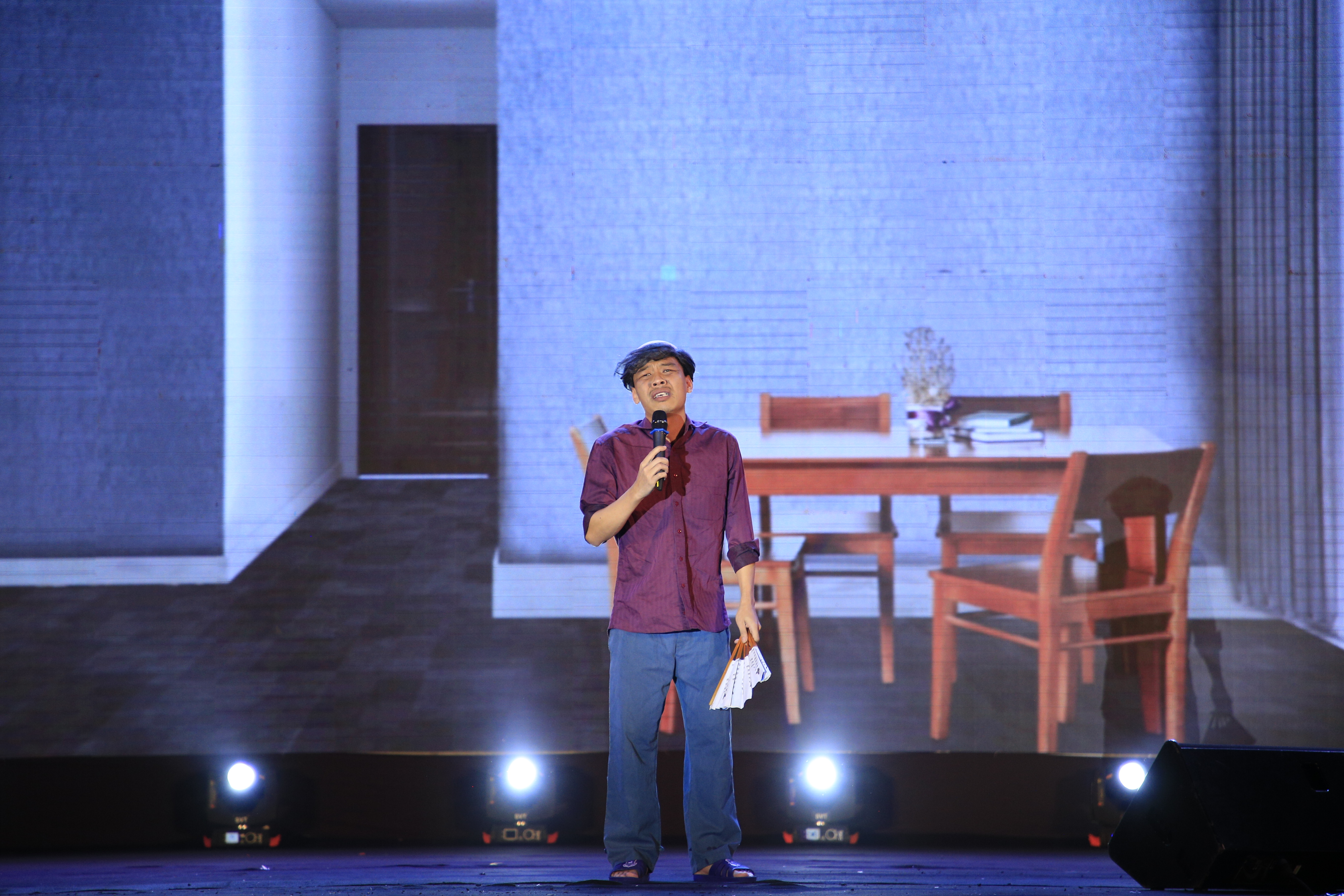 - Chào nghệ sĩ Trung Ruồi! Là một diễn viên không có ngoại hình xuất sắc, khi đứng chung sân khấu với những nghệ sĩ nổi tiếng, điển trai như Noo Phước Thịnh, Tim trong chương trình truyền hình, anh có cảm thấy áp lực về ngoại hình?