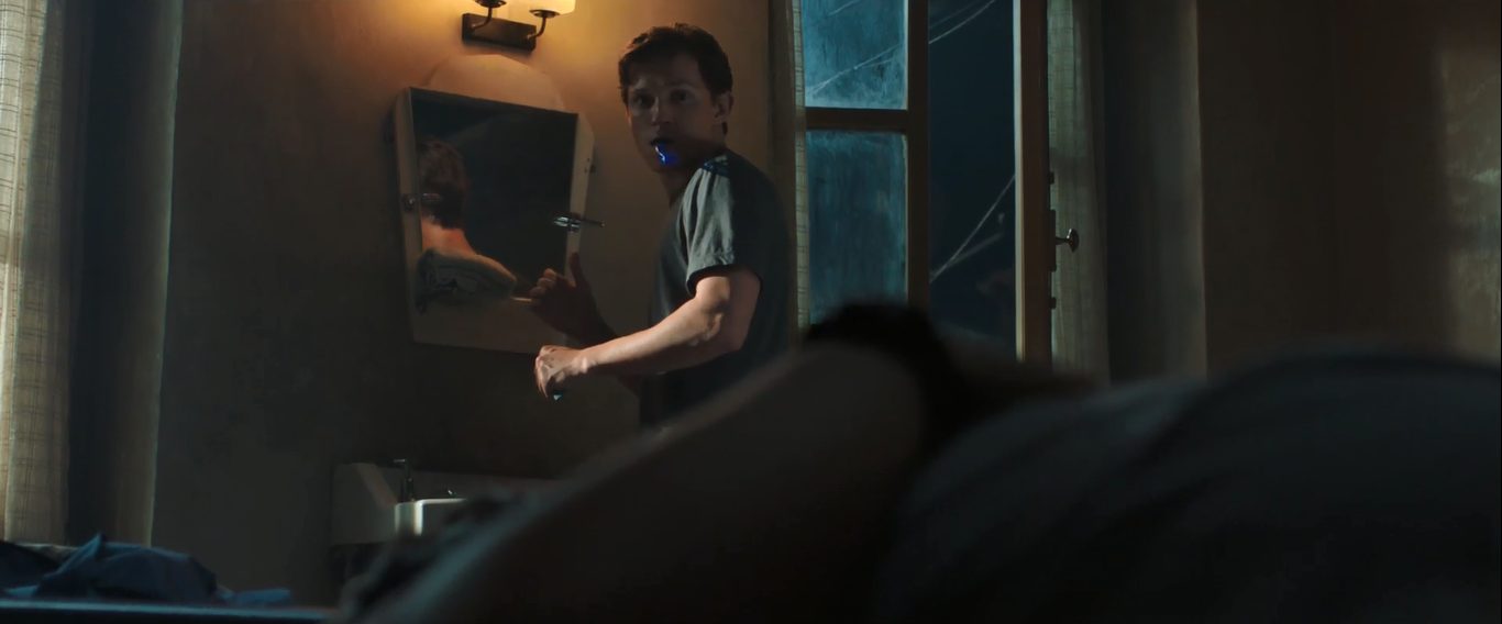 Phân cảnh quan trọng của trailer xuất hiện: Peter Parker ở trong phòng khách sạn trong khi bạn cùng phòng là Ned (Jacob Batalon) bước vào, bất ngờ cậu ta bị kim tiêm thuốc mê bắn vào người khiến bất tỉnh.