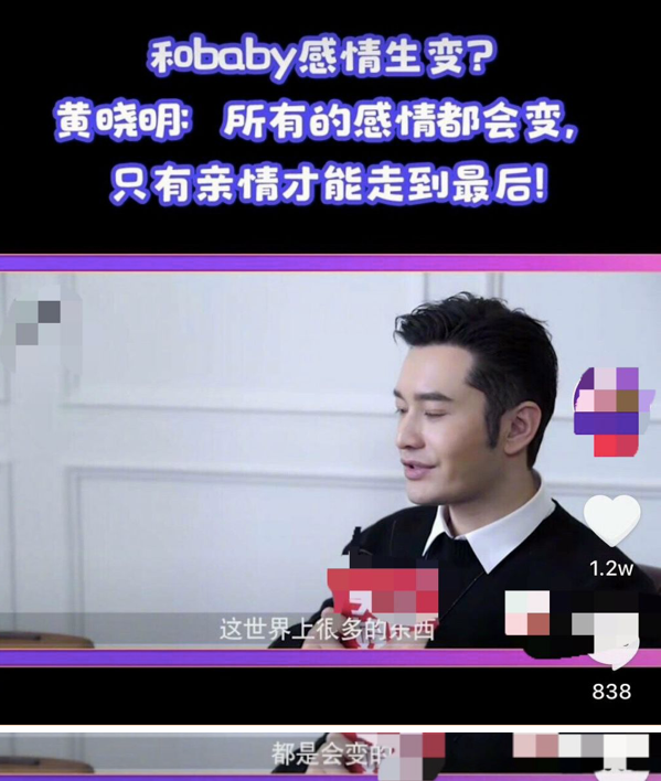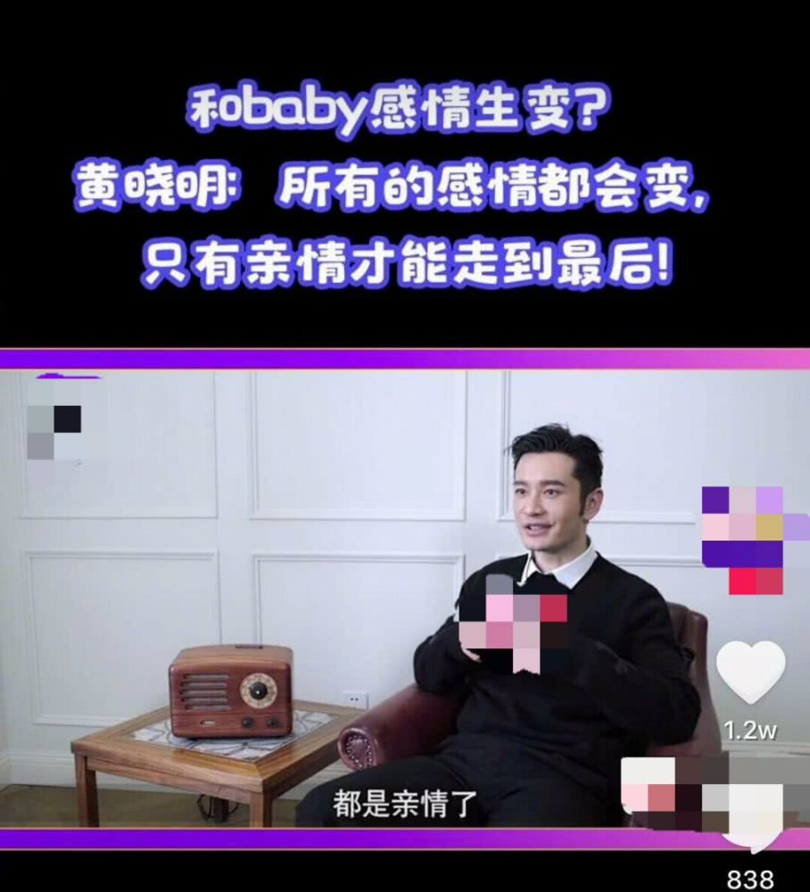 Lời nói của Huỳnh Hiểu Minh trong một đoạn phỏng vấn gần đây càng làm người khác cảm thấy nghi ngờ tình cảm giữa nam diễn viên và Angelababy đã sớm sinh biến. Huỳnh Hiểu Minh thẳng thắn bày tỏ: “Trên thế giới có rất nhiều thứ đều sẽ thay đổi, đến cuối cùng chỉ có tình thân là mãi còn đó mà thôi”. Thậm chí khi Huỳnh Hiểu Minh nói những lời đó, biểu cảm trên mặt cũng có chút đau lòng.