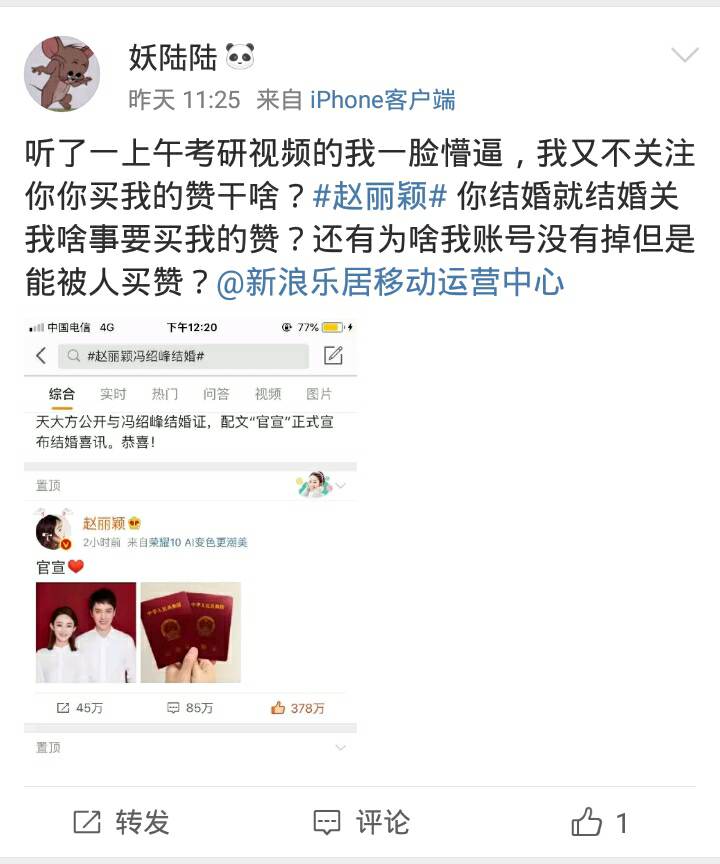 - Cái bài viết đó của Triệu Lệ Dĩnh có phải đã mua like rồi không??? Tôi mới vừa mở weibo là đã thấy mình like bài viết đó rồi???