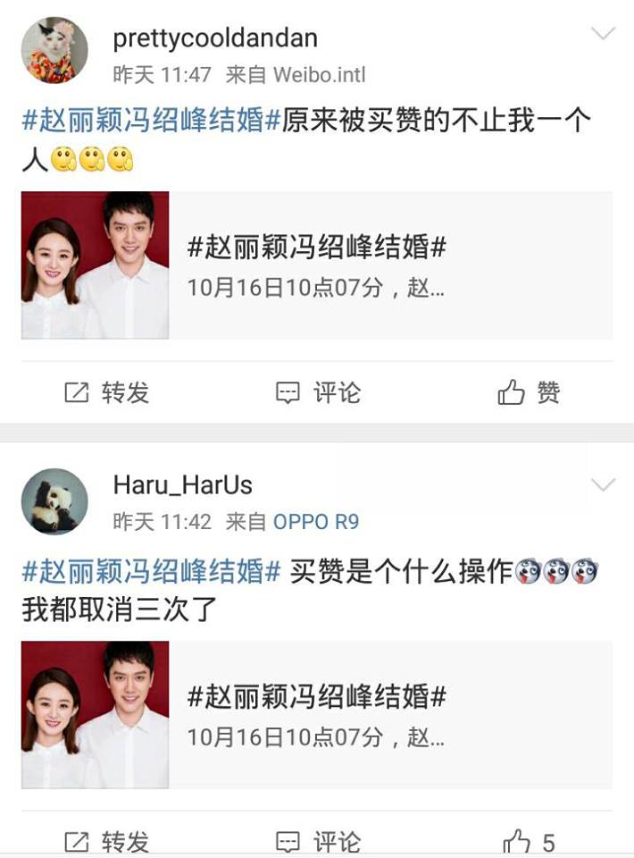 - Vừa mới mở weibo là thấy mình “bị” like rồi, lần đầu tiên phát hiện bị mua like á #Triệu Lệ Dĩnh Phùng Thiệu Phong kết hôn#, vẫn nên chúc phúc vậy.