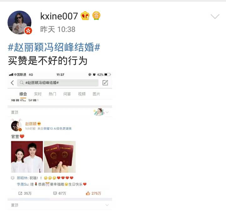 - #Triệu Lệ Dĩnh Phùng Thiệu Phong kết hôn# mua like là hành vi không tốt đó nha.