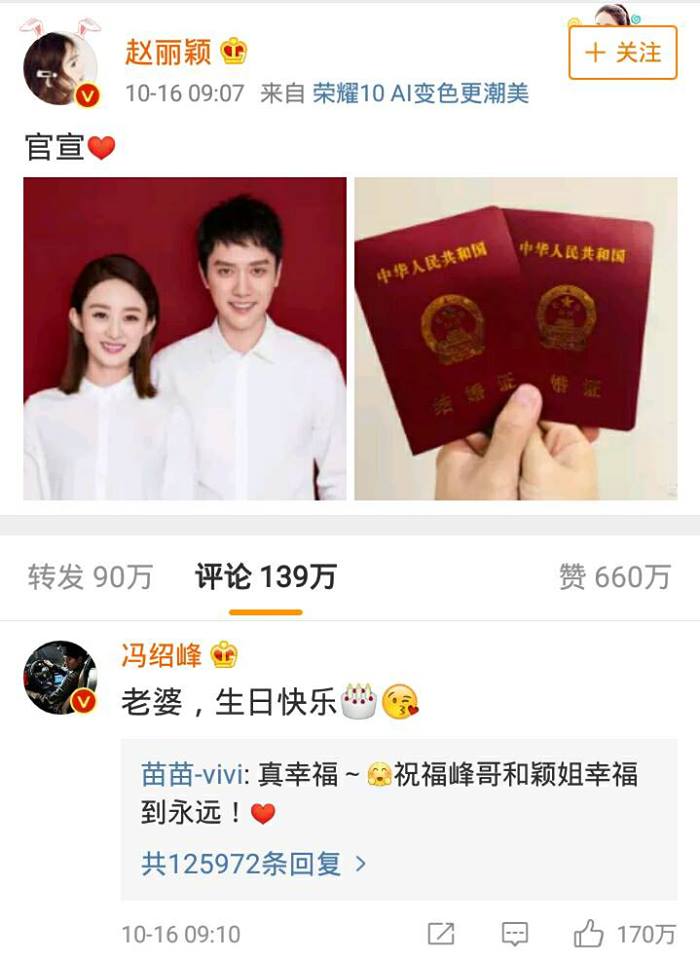 Phùng Thiệu Phong và Triệu Lệ Dĩnh sau bao tin đồn hẹn hò cùng nhau cuối cùng cả hai cũng có thể chính thức về chung một nhà vào ngày hôm qua khi cả hai tuyên bố đã làm giấy kết hôn cùng nhau với bài viết: “Tuyên bố chính thức”. Ngay sau đó, thông tin tìm kiếm Phùng Thiệu Phong Triệu Lệ Dĩnh kết hôn lập tức ngồi vào top 1 bảng hot search, gây ra hiện tượng weibo bị tắt nghẽn.