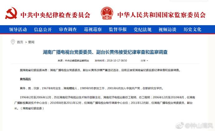 Sau vài ngày tranh cãi thì hôm nay ngày 17 tháng 10 theo kênh Sohu đưa tin: “Theo tin tức của trang mạng Trung Ương Kỷ Ủy quốc gia tỉnh Hồ Nam đưa tin: Ủy viên đảng ủy đài truyền hình Hồ Nam, phó đài trưởng Hoàng Vĩ bị nghi ngờ có hành vi vi phạm pháp luật nghiêm trọng, trước mắt đang tiếp nhận quá trình điều tra giám sát và thẩm tra kỷ luật của kỉ ủy giam ủy tỉnh Hồ nam”.