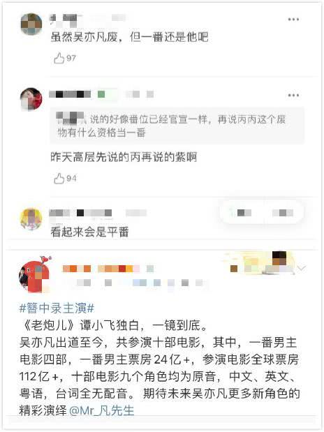 Nhiều lần, dân mạng lên tiếng chỉ trích Ngô Diệc Phàm, cho rằng anh không có tư cách để đảm nhận phiên vị nhất phiên. Tuy nhiên, theo lời giải thích của đoàn làm phim thì lần công bố chỉ sắp xếp dựa vào tên pinyin mà thôi. Nên Ngô Diệc Phàm được đứng trước, không tồn tại việc so sánh phiên vị giữa hai người. Vì vậy, hành động tranh đoạt lần này của fan hâm mộ có phần ấu trĩ.
