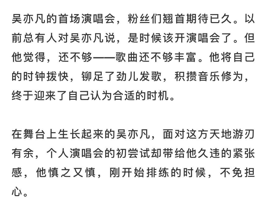 Trong một lần phỏng vấn của tạp chí Harper's Bazaar, Ngô Diệc Phàm khi nhắc đến tâm lý chuẩn bị cho buổi concert đầu tiên, anh cho rằng việc chuẩn bị vẫn chưa đủ, nên làm tốt hơn nữa, và đang đợi một thời cơ, có lẽ đây chính là cảm giác “nguy hiểm” của anh, mới có thể nghiêm khắc thực hiện làm chúng trở nên tốt hơn.