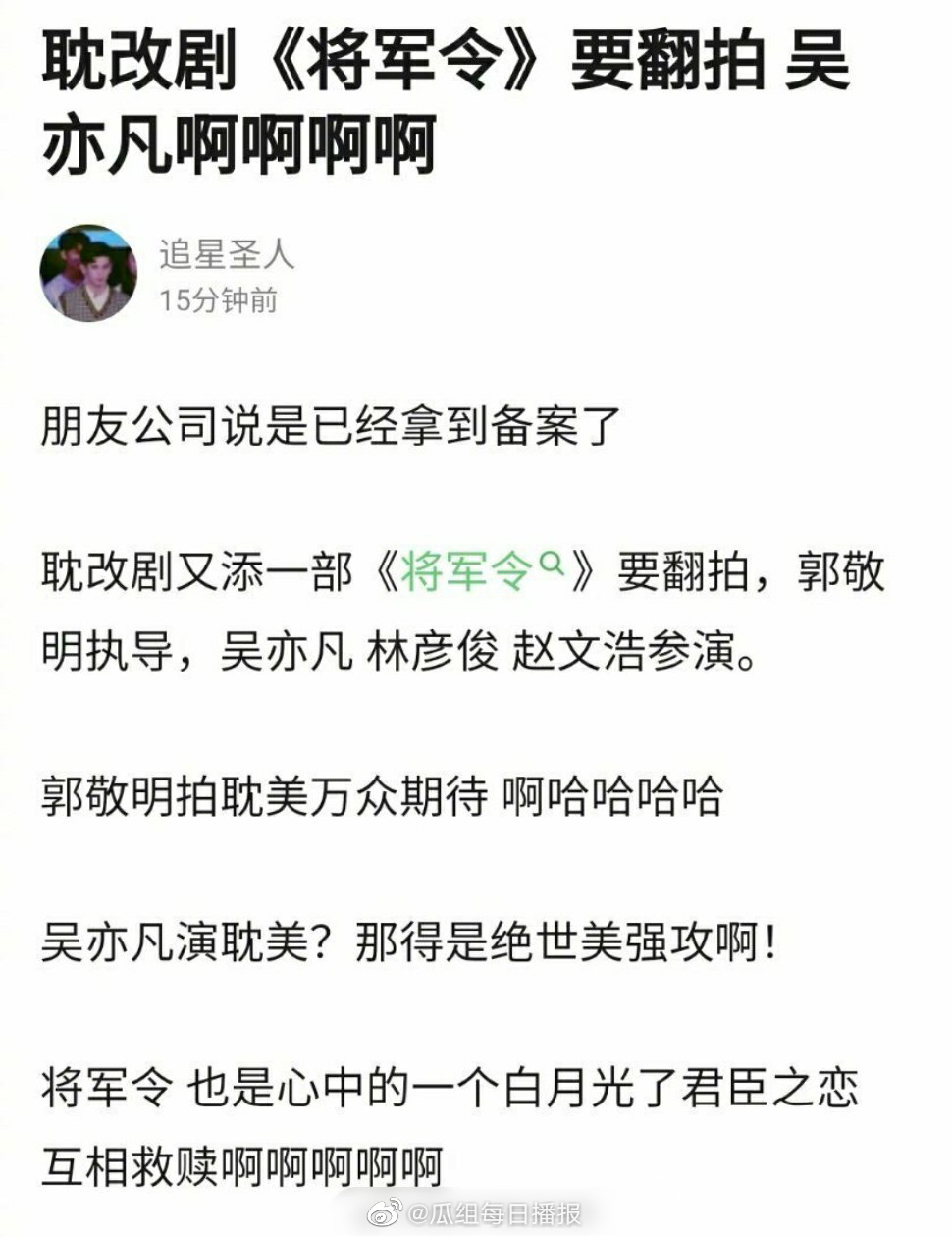 Mới đây, trên mạng xã hội weibo xuất hiện tin: “Thêm một tác phẩm tiểu thuyết đam mỹ mới mang tên Tướng quân lệnh sẽ được khởi quay trong thời gian sắp tới”. Tác phẩm do Quách Kính Minh chỉ đạo, Ngô Diệc Phàm và Lâm Ngạn Tuấn đảm nhận vai chính. Tướng quân lệnh là tiểu thuyết đam mỹ nổi tiếng của tác giả Tiểu Thảo, là câu chuyện tình yêu quân thần, bạch nguyệt quang trong lòng đọc giả, xoay quanh hai nhân vật chính Trần Tắc Minh và Tiêu Định.