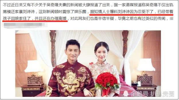 Gần đây, truyền thông có nơi đưa tin: “Hôn nhân của Lưu Thi Thi và Ngô Kỳ Long gặp khủng hoảng và nguyên nhân trực tiếp là do có kẻ thứ ba. Ngô Kỳ Long không những ngoại tình mà còn sử dụng bạo lực với Lưu Thi Thi. Nam diễn viên không hề ăn năn, hối hận trước hành động của mình mà còn muốn ép Lưu Thi Thi phải ly lôn. Tình tiết drama này khiến dư luận cảm thấy tức giận”.
