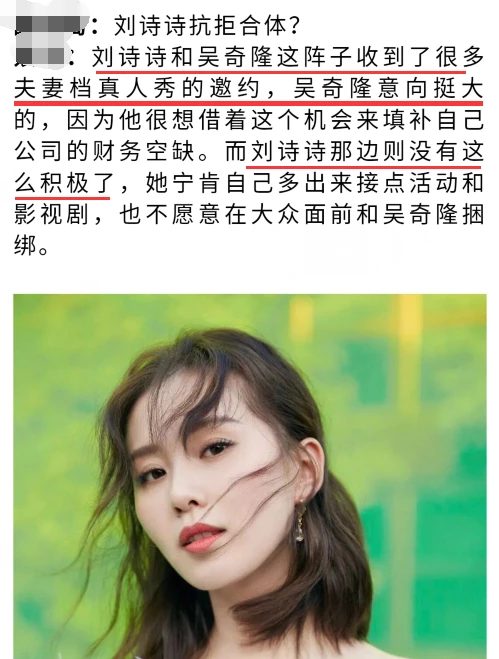 Vài ngày trước, dân mạng Trung Quốc lan truyền nguồn tin cho biết Lưu Thi Thi nhất quyết từ chối lời đề nghị của Ngô Kỳ Long khi muốn đem chuyện hôn nhân, gia đình lên show giải trí. Bởi vì thời gian gần đây, cả hai vợ chồng Thi - Long đều nhận được rất nhiều lời mời tham gia chương trình thực tế, Ngô Kỳ Long liền đồng ý để bù vào khoản tài chính thiếu hụt của công ty. Thế nhưng Lưu Thi Thi lại khước từ và không muốn “sao tác” (dựa vào tên tuổi lẫn nhau để cùng PR bản thân mình) trên sóng truyền hình.