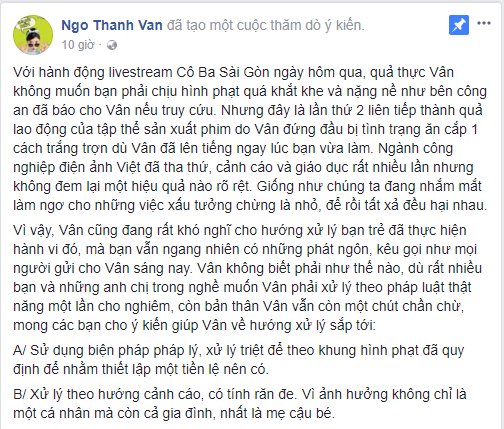 Trong lúc đó, “đả nữ” Ngô Thanh Vân đã tạo cuộc thăm dò ý kiến trên fanpage của mình. Chị cho biết, với hành động livestream Cô Ba Sài Gòn ngày hôm qua, “quả thực Vân không muốn bạn phải chịu hình phạt quá khắt khe và nặng nề như bên công an đã báo cho Vân nếu truy cứu. Nhưng đây là lần thứ 2 liên tiếp thành quả lao động của tập thể sản xuất phim do Vân đứng đầu bị tình trạng ăn cắp 1 cách trắng trợn dù Vân đã lên tiếng ngay lúc bạn vừa làm. Ngành công nghiệp điện ảnh Việt đã tha thứ, cảnh cáo và giáo dục rất nhiều lần nhưng không đem lại một hiệu quả nào rõ rệt. Giống như chúng ta đang nhắm mắt làm ngơ cho những việc xấu tưởng chừng là nhỏ, để rồi tất xả đều hại nhau”.