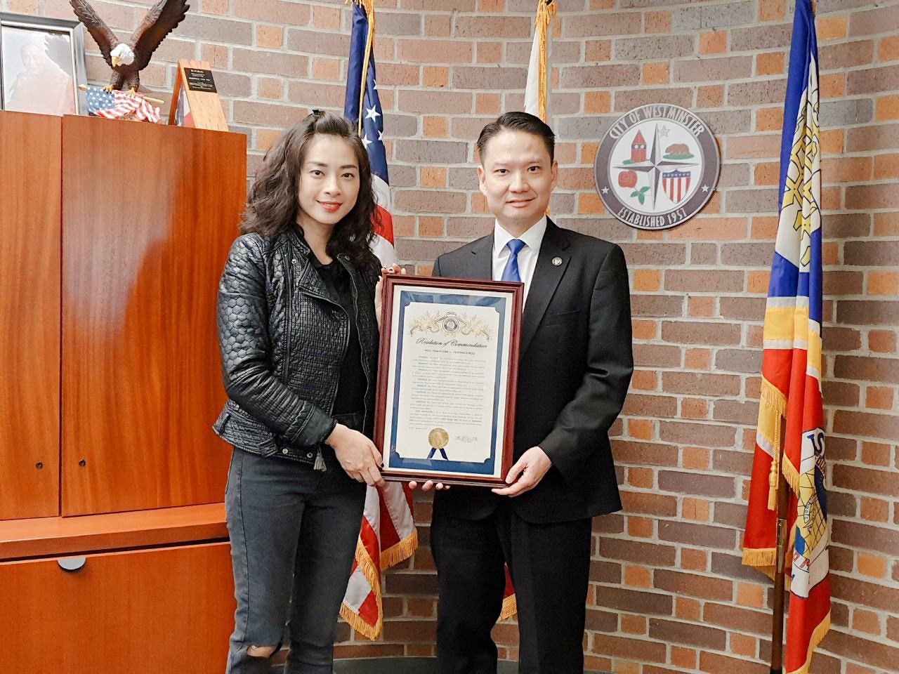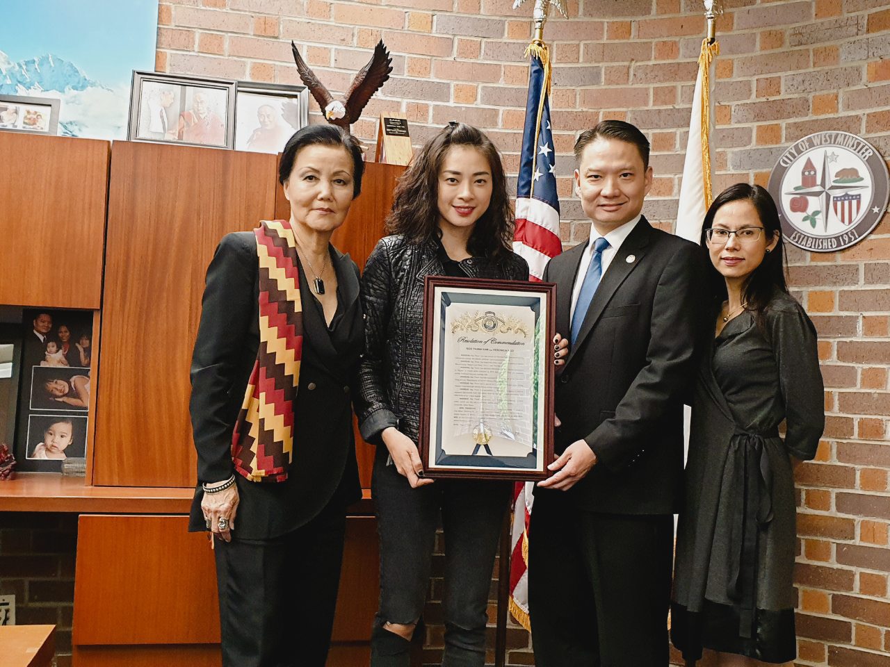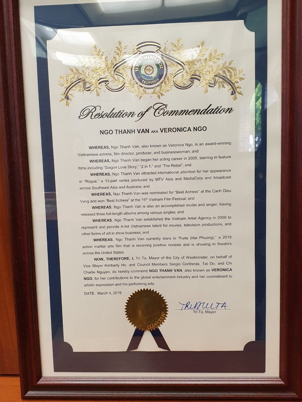 Với những nỗ lực không mệt mỏi của mình trong sự nghiệp điện ảnh và quảng bá hình ảnh con người Việt Nam ra thế giới trong suốt hơn một thập kỷ qua, Ngô Thanh Vân đã được đích thân ngài Thị trưởng thành phố Westminster - Ông Trí Tạ trao tặng bằng khen vinh danh ngay trong thời gian cô đang có mặt ở Mỹ để quảng bá dự án phim Hai Phượng.