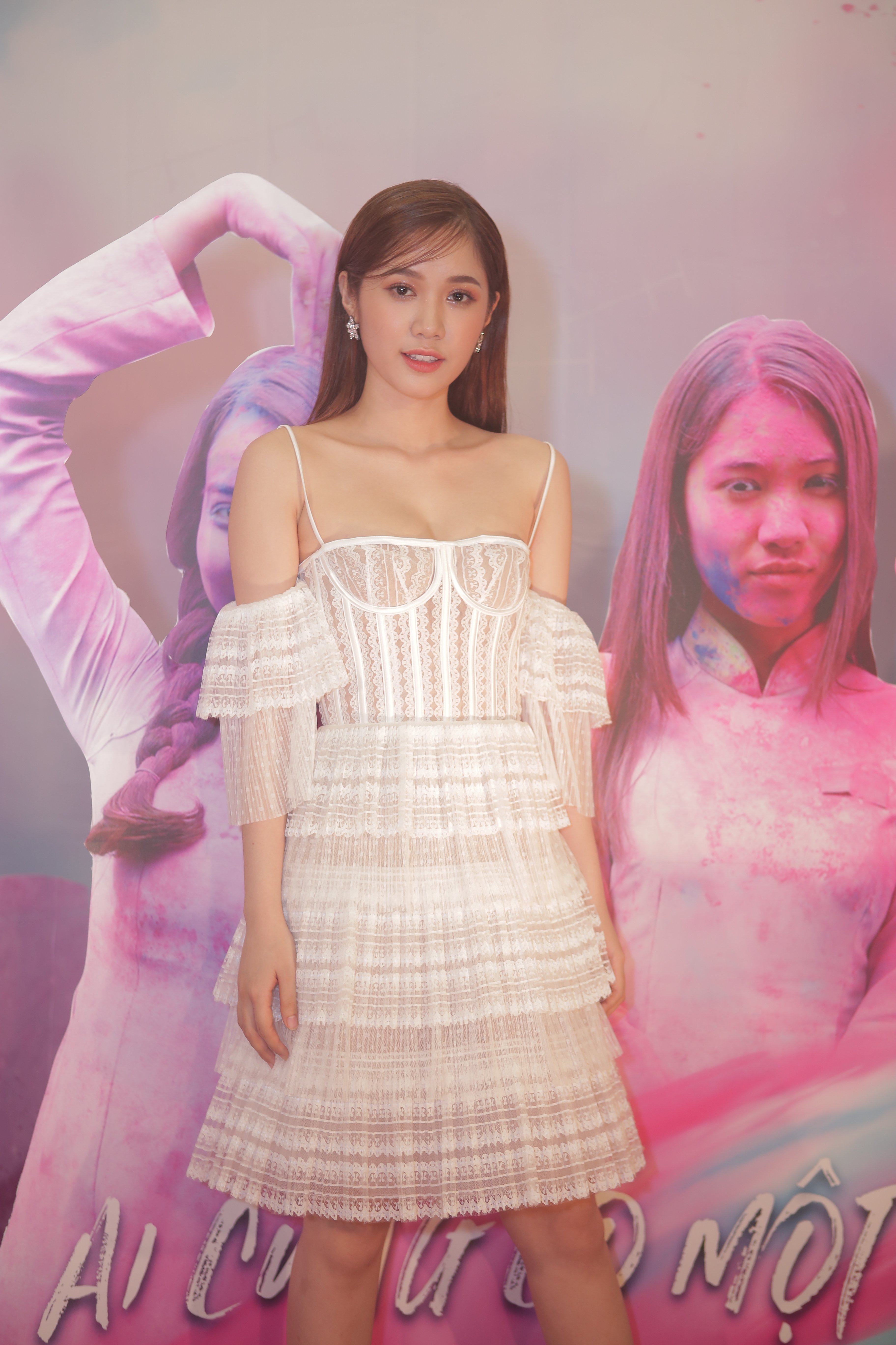 Tương tự các diễn viên nữ khác của phim, Gia Linh chọn trang phục màu trắng.