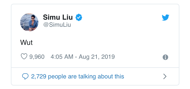 Trả lời cho tin tức này, Simu Liu - người gần đây được chọn vào vai Shang-Chi của Vũ trụ Điện ảnh Marvel đã đăng tải lên Twitter một dòng trạng thái đơn giản là “Wut“. Việc làm của Sony đã làm phật lòng người hâm mộ Marvel vì hàng loạt lý do và phần lớn là vì nó có khả năng ngăn Peter Parker/Spider-Man của Tom Holland xuất hiện trong MCU.