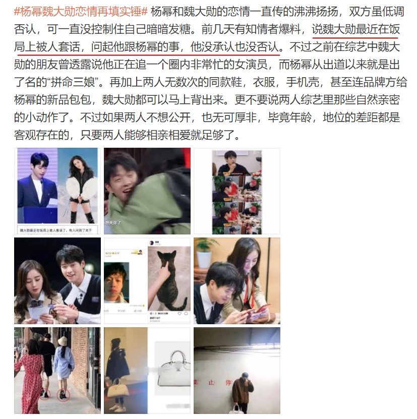 Từ hình ảnh được tiết lộ vào tháng 8 năm nay khi dân mạng vô tình trông thấy Dương Mịch và Ngụy Đại Huân xuất hiện bên nhau trong một khu triển lãm và trên đường phố. Dư luận bán tín bán nghi trước mối quan hệ giữa cả hai nhưng Ngụy Đại Huân nhanh chóng đáp trả trên Weibo cho biết họ chỉ là bạn bè. Thế nhưng bên phía Dương Mịch, cô vẫn luôn im lặng trước chuyện này.