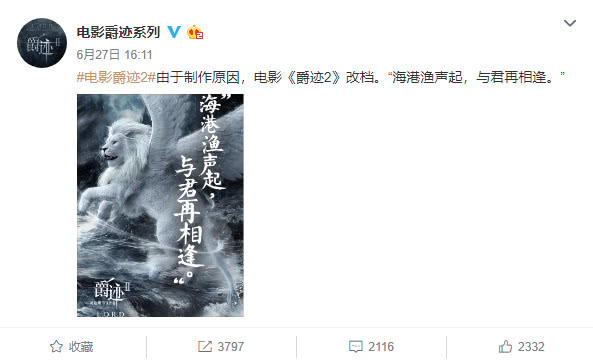 Vào buổi chiều ngày 27 tháng 6, tài khoản Weibo chính thức của phim điện ảnh Tước Tích đã đưa ra thông báo rằng Tước Tích 2 sẽ thay đổi lịch chiếu kèm theo dòng trạng thái được đăng tải: “Vì nguyên nhân chế tác nên bộ phim điện ảnh Tước Tích 2 sẽ thay đổi lịch trình chiếu”, thế nhưng ekip lại hề không công bố thời gian công chiếu mới.