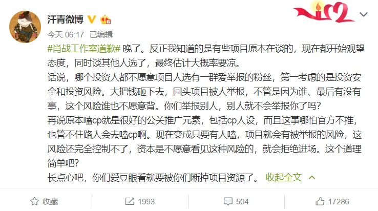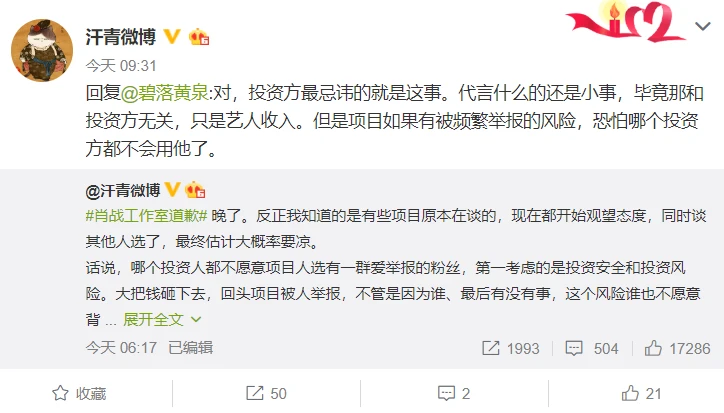 Hiện tại, phía nhà đầu tư đang có thái độ quan sát cách giải quyết rắc rối của đoàn đội Tiêu Chiến. Trong khi chờ đợi, họ cũng cân nhắc các ứng viên khác có thể thay thế anh chàng. Đồng thời, tài khoản này còn đưa ra lời khuyên dành cho fan hâm mộ Tiêu Chiến: “Hãy để tâm, có lý trí chút đi, chính các người đang hại thần tượng của mình mất chén cơm đấy!”.
