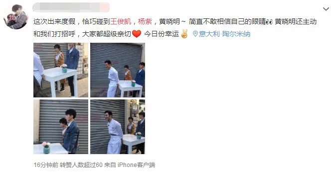 Cư dân mạng đều nhận xét ba người họ rất thân thiện, Huỳnh Hiểu Minh còn chủ động chào hỏi. Trong hình, Huỳnh Hiểu Minh mặc quần áo của đầu bếp, còn Vương Tuấn Khải mặc áo khoác jiean, quần đen, Dương Tử thì áo Tshirt trắng vô cùng đáng yêu. Dưới sự “dẫn dắt” của Huỳnh Hiểu Minh ba người cùng nhau khiêng bàn đi về phía trước nhà hàng, Vương Tuấn Khải lâu lâu lại quay qua trò chuyện với Dương Tử. Vừa đi vừa trò chuyện, khuôn mặt ba người họ đôi lúc còn nở nụ cười.
