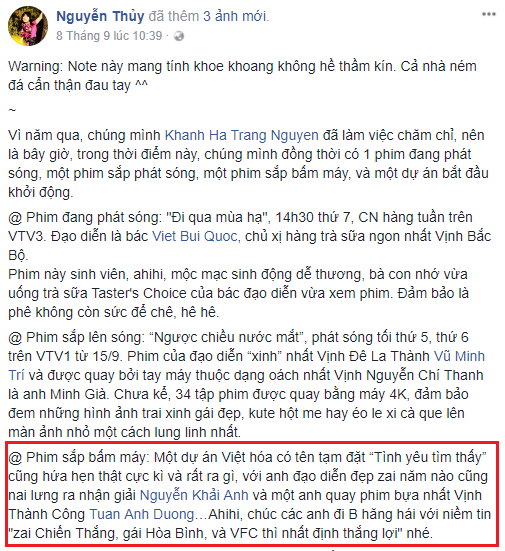 Đặc biệt, chị “bật mí” dự án phim hiện trong quá trình chuẩn bị có tên Tình yêu tìm thấy và hứa hẹn: “Một dự án Việt hóa có tên tạm đặt Tình yêu tìm thấy cũng hứa hẹn thật cực kì và rất ra gì, với anh đạo diễn đẹp trai năm nào cũng nai lưng ra nhận giải Nguyễn Khải Anh và một anh quay phim Tuấn Anh Dương… Chúc các anh đi B hăng hái với niềm tin: Trai Chiến Thắng, gái Hòa Bình và VFC thì nhất định thắng lợi nhé”.