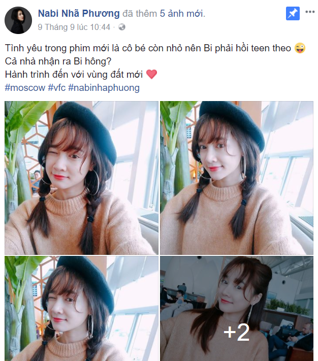 Như vậy, đạo diễn Nguyễn Khải Anh một lần nữa chọn Nhã Phương cho dự án phim của mình. Trong hình ảnh tại Moscow, Nga mới nhất đăng tải trên mạng xã hội, nữ diễn viên sinh năm 1990 chia sẻ: “Tình yêu trong phim mới là cô bé còn nhỏ nên Bi phải hồi teen theo. Cả nhà nhận ra Bi không?” kèm hashtag #VFC. Qua đó, khán giả nhìn thấy hình ảnh người đẹp trẻ trung, tươi mới cùng mái thưa trong sáng và tóc bện.