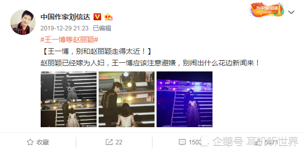 Mới đây, Lưu Tín Đạt - Hiệp hội tác giả Trung Quốc lên tiếng cảnh báo Vương Nhất Bác với động thái “thân mật” vừa qua cùng Triệu Lệ Dĩnh. Ông nhắc nhở Vương Nhất Bác khi cho rằng Triệu Lệ Dĩnh đã kết hôn làm vợ người khác. Trong khi Vương Nhất Bác là minh tinh độc thân, nên phải chú ý hành động, cẩn trọng để tránh hiềm nghi và đừng tạo nên bất kỳ tin tức sao tác nào (sao tác: tạo hiệu ứng cặp đôi).