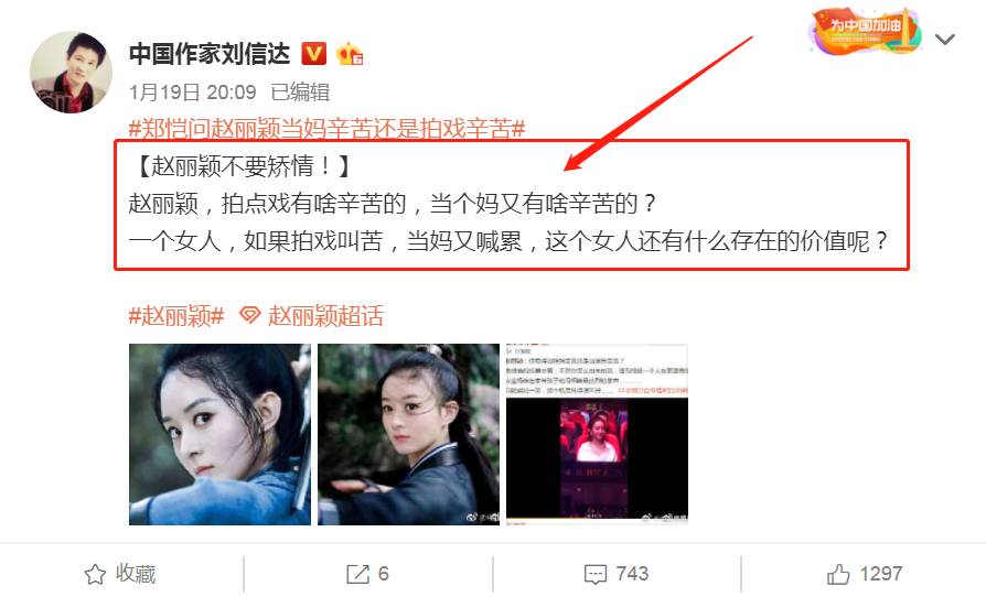 Nhìn thấy thái độ của nàng tiểu hoa, Lưu Tín Đạt đã bắt đầu công khai chỉ trích Triệu Lệ Dĩnh trên mạng xã hội: “Quay phim, làm mẹ thì có gì vất vả, phụ nữ than mệt thì làm gì còn giá trị?“. Được biết, Lưu Tín Đạt chính là nhà văn chuyên cà khịa, hầu hết những minh tinh nổi tiếng đều không thoát khỏi sự mỉa mai, đâm chọt của vị tác giả này. Triệu Lệ Dĩnh nằm không cũng trúng đạn khi cô chưa hề lên tiếng than vãn.
