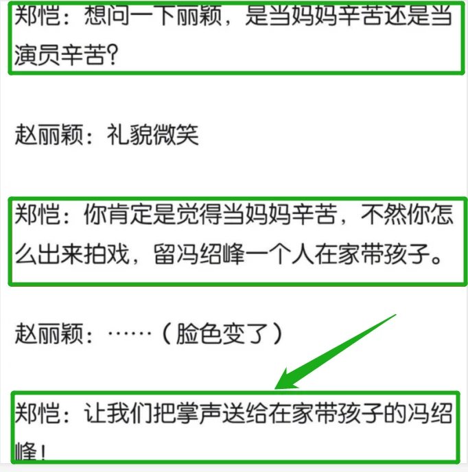 Trong buổi lễ này cũng diễn ra một sự việc vô cùng ngượng ngừng khi Trịnh Khải hỏi Triệu Lệ Dĩnh: “Muốn hỏi Lệ Dĩnh một chút, em cảm thấy làm mẹ hay làm diễn viên vất vả hơn?“. Nhưng chưa đợi Triệu Lệ Dĩnh lên tiếng trả lời, Trịnh Khải đã tự hỏi tự đáp: “Chắc chắn em cảm thấy làm mẹ vất vả hơn rồi, nếu không thì sao em lại quay trở về quay phim để Phùng Thiệu Phong một mình ở nhà chăm đứa bé cơ chứ, chúng ta hãy dành tràng vỗ tay nhiệt liệt dành cho Phùng Thiệu Phong đang ở nhà chăm con nào!”. Sắc mặt Triệu Lệ Dĩnh lập tức thay đổi, nụ cười chợt tắt, nét mặt trở nên nghiêm túc hơn.